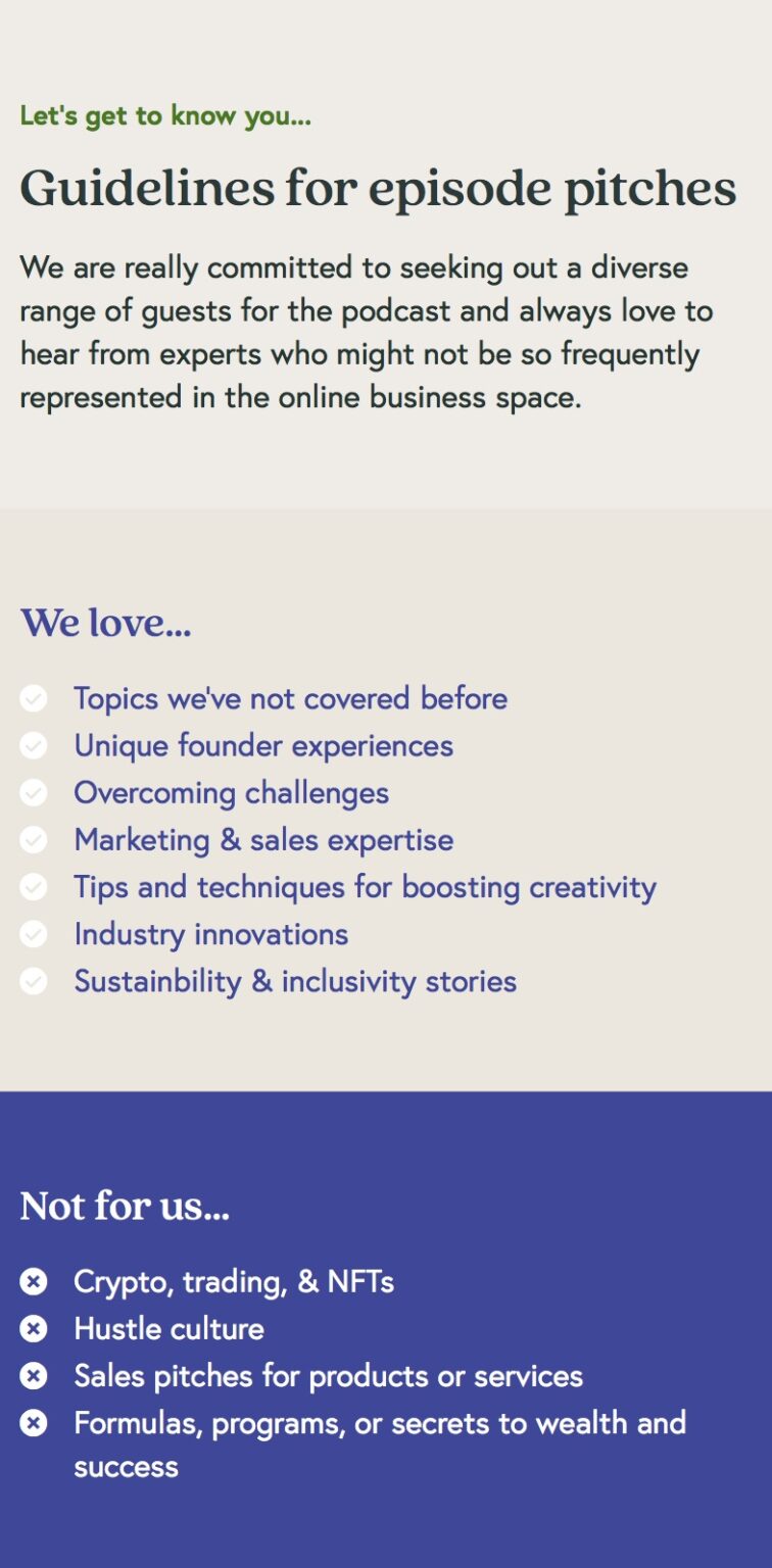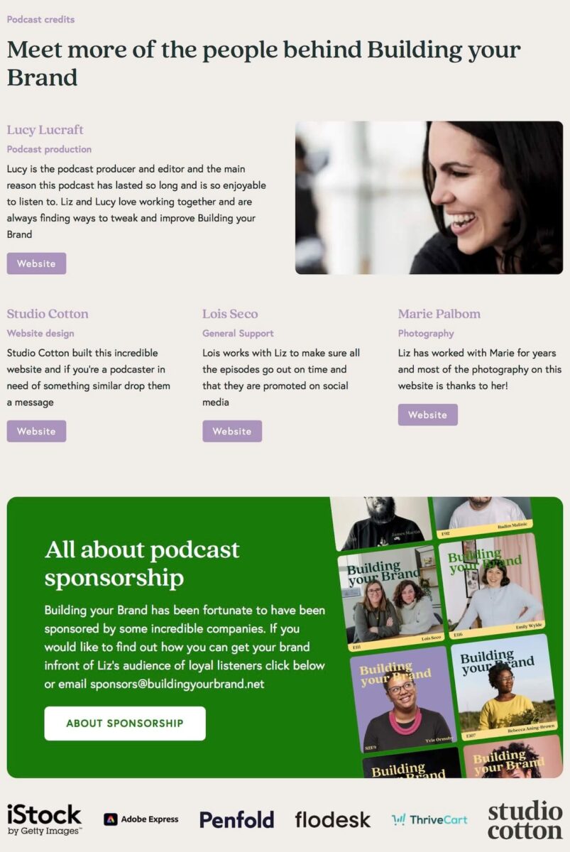 The Guest Media page is a hidden page sent directly to Building your Brand interviewees, sharing everything they need to promote the podcast and make it easier than ever for Liz to tottle up those SEO backlinks.
